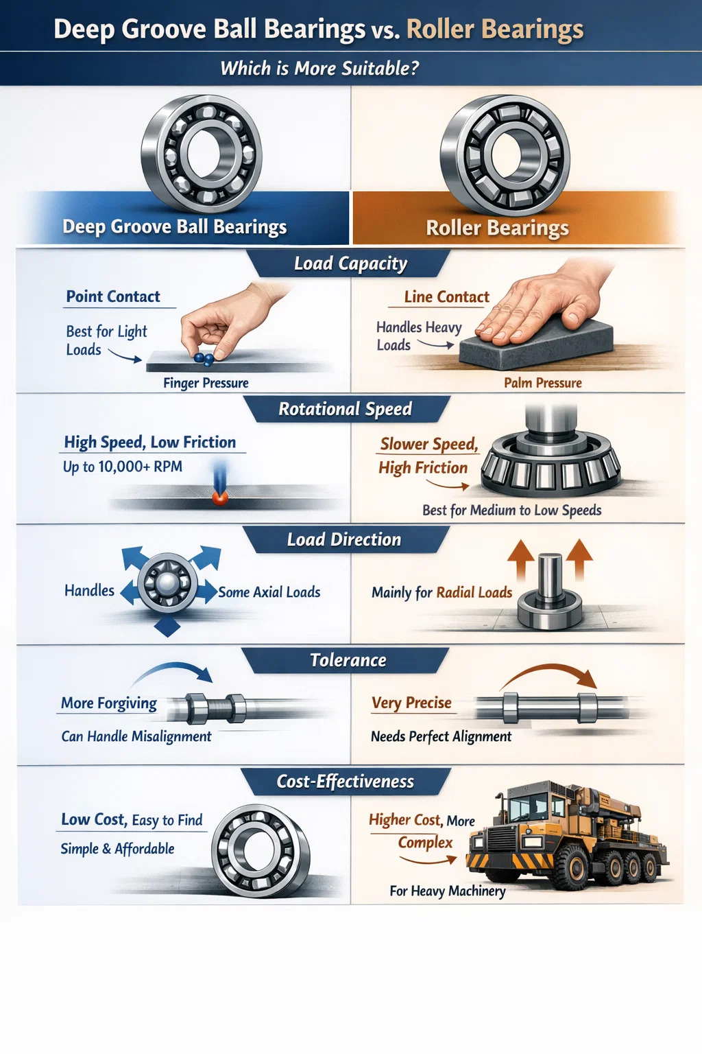 في عالم المحامل، لا يوجد مطلق "أيهما أفضل"، فقط "أيهما أكثر ملاءمة". محامل الكرات الأخدود العميق والمحامل الدوارة تشبه أحذية الجري وأحذية المشي لمسافات طويلة - ولكل منها نقاط قوة خاصة بها.