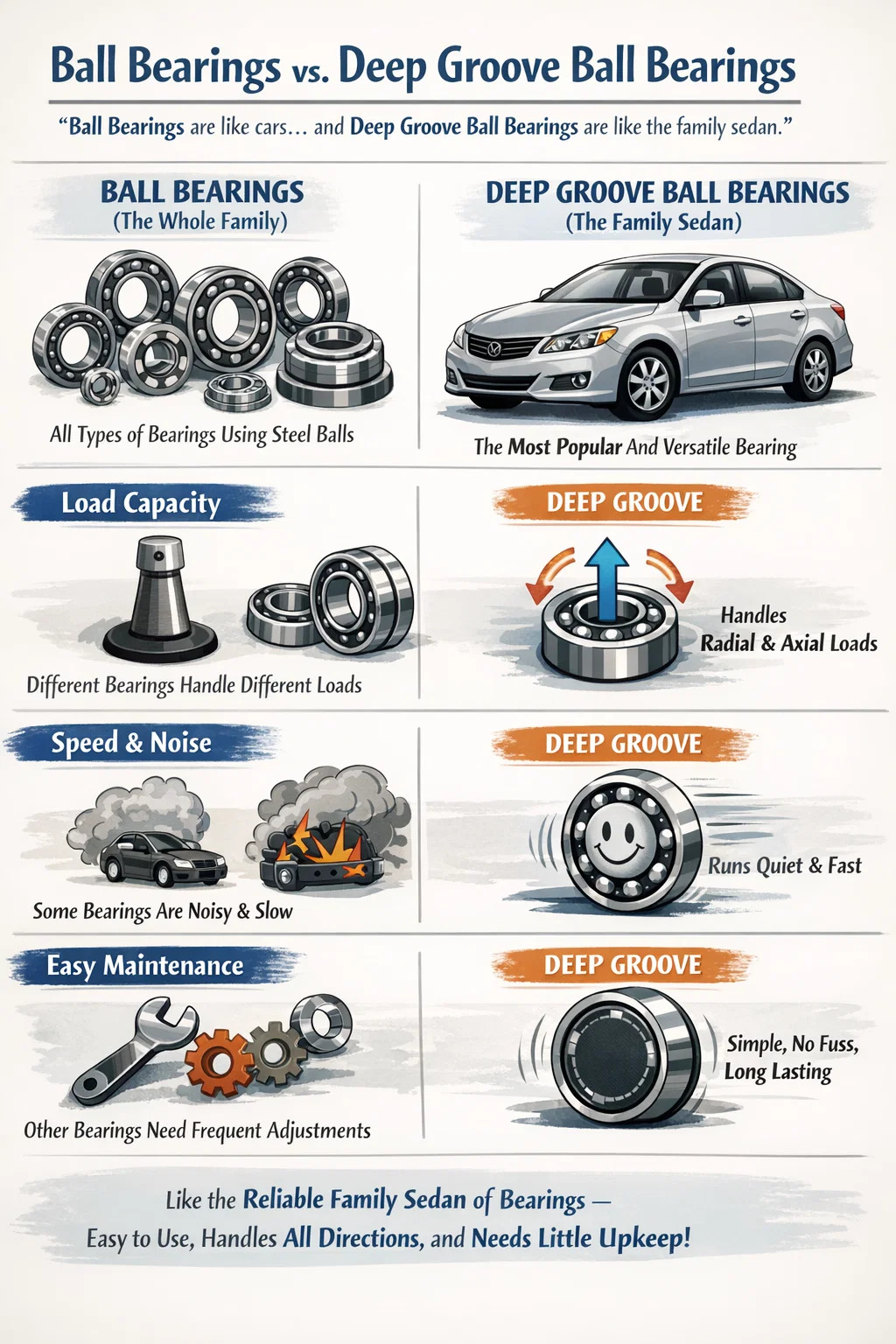 يمكنك التفكير في المحامل الكروية على أنها "سيارات" و محامل الكرات الأخدود العميق باعتبارها "سيارة السيدان العائلية" الأكثر شيوعًا.